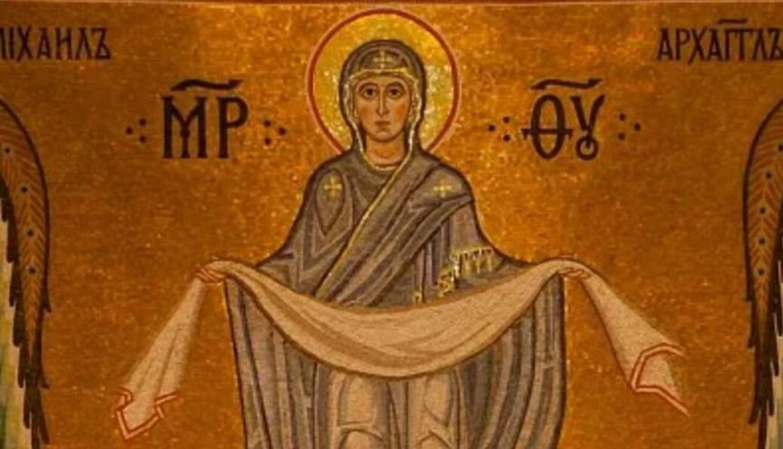 The history of the feast goes back to the life of Andrew the Fool-for-Christ: during an all-night service he saw the Virgin Mary, who appeared in the air and held a cover over those praying - the maphorion, the traditional shawl women wore over the inner scarf. In icons the outer shawl is in Mary’s hands, while her head remains covered.
